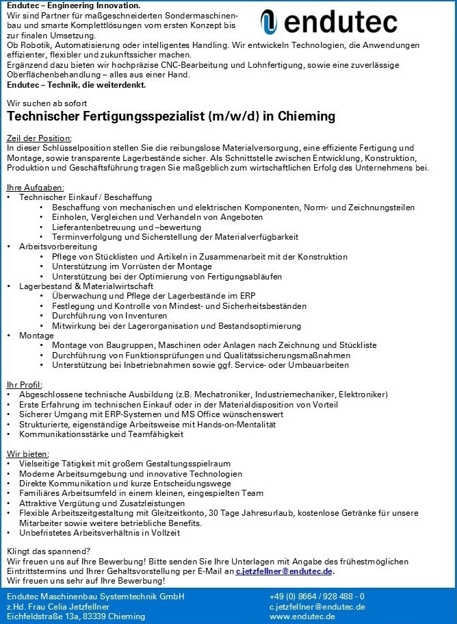 Haben wir Ihr Interesse geweckt? Dann freuen wir uns auf Ihre aussagekräftige Bewerbung mit Angabe des frühestmöglichen Eintrittstermins und Ihrer Gehaltsvorstellung. Bitte senden Sie Ihre Unterlagen ausschließlich per Email an c.jetzfellner@endutec.de.